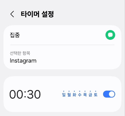 타이머 설정 시 이용 시간을 설정할 앱을 선택하시고 시간과 요일 등을 설정하신 후 작동시키면 됩니다.